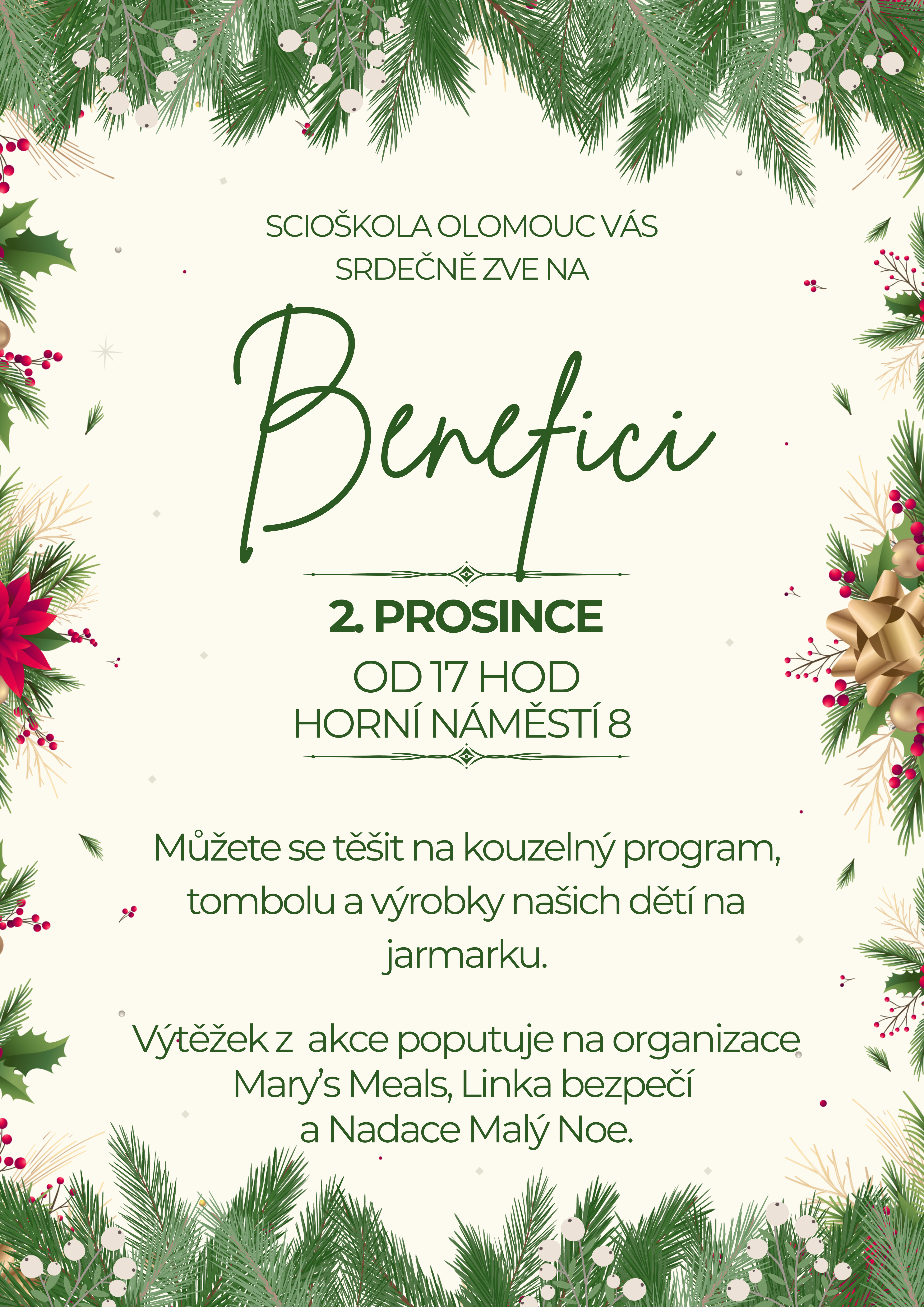 Zveme všechny rodiče, děti, ale i veřejnost! Přijďte ochutnat dobroty našich dětí, koupit si ručně dělaný dárek, shlédnout kulturní vystoupení a podpořit tak dobrou věc! Letos si děti odhlasovaly hned 3 organizace, kterým chtějí pomoci.